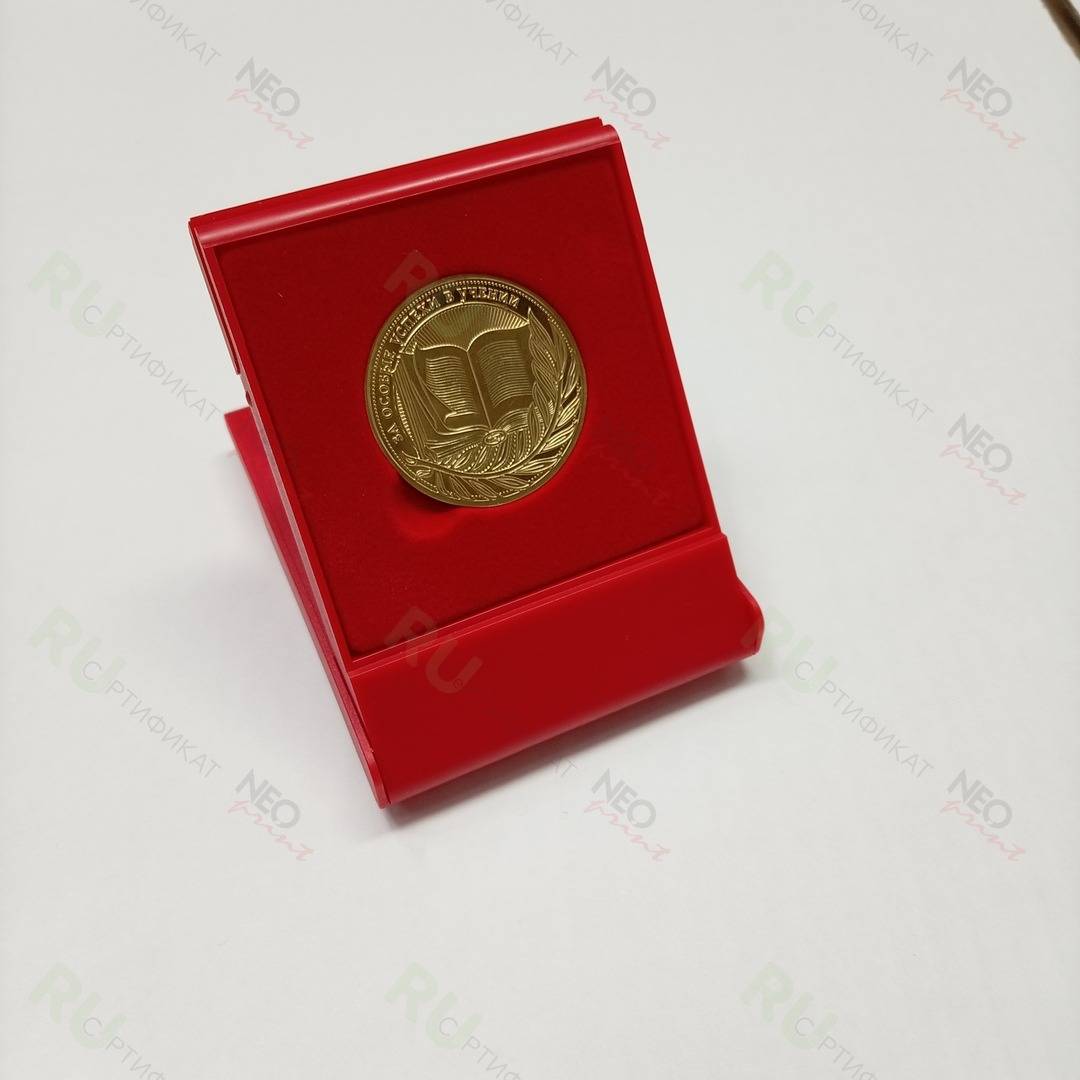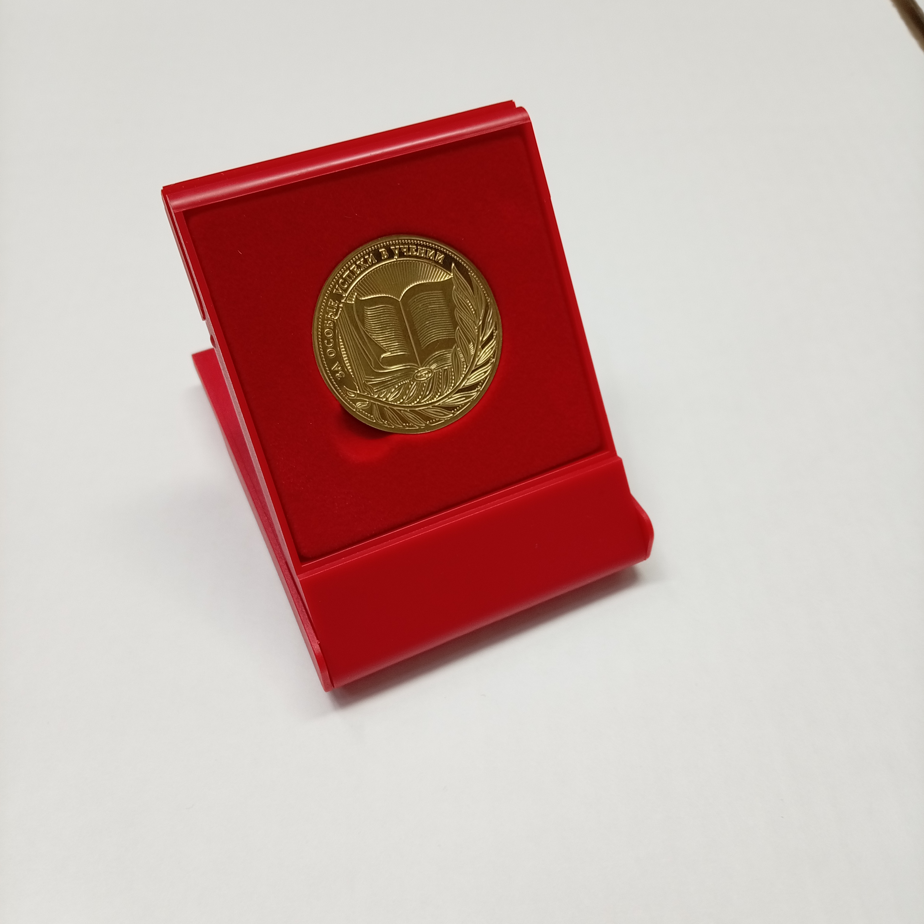 Медаль упаковывается в пластиковый футляр с изображением Государственного герба Российской Федерации, в бархатном ложементе футляра - углубление под медаль. Для медали "За особые успехи в учении" I степени используется футляр красного цвета.